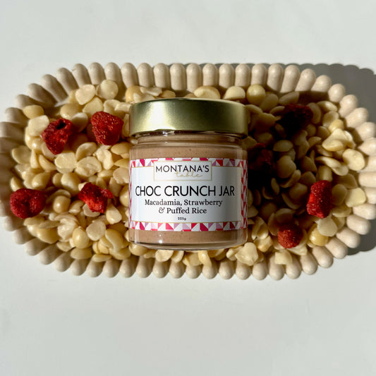 Rich, velvety, melt-in-your-mouth chocolate brimming with crispy, crunchy additions. Think puffed rice, wafer pieces, freeze dried fruits, nuts and more. These choc crunchy jars are perfect for drizzling over ice cream, stuffing into cookies, slathering on cakes, elevating desserts, or—let’s be honest—grabbing a spoon and eating it straight from the jar!