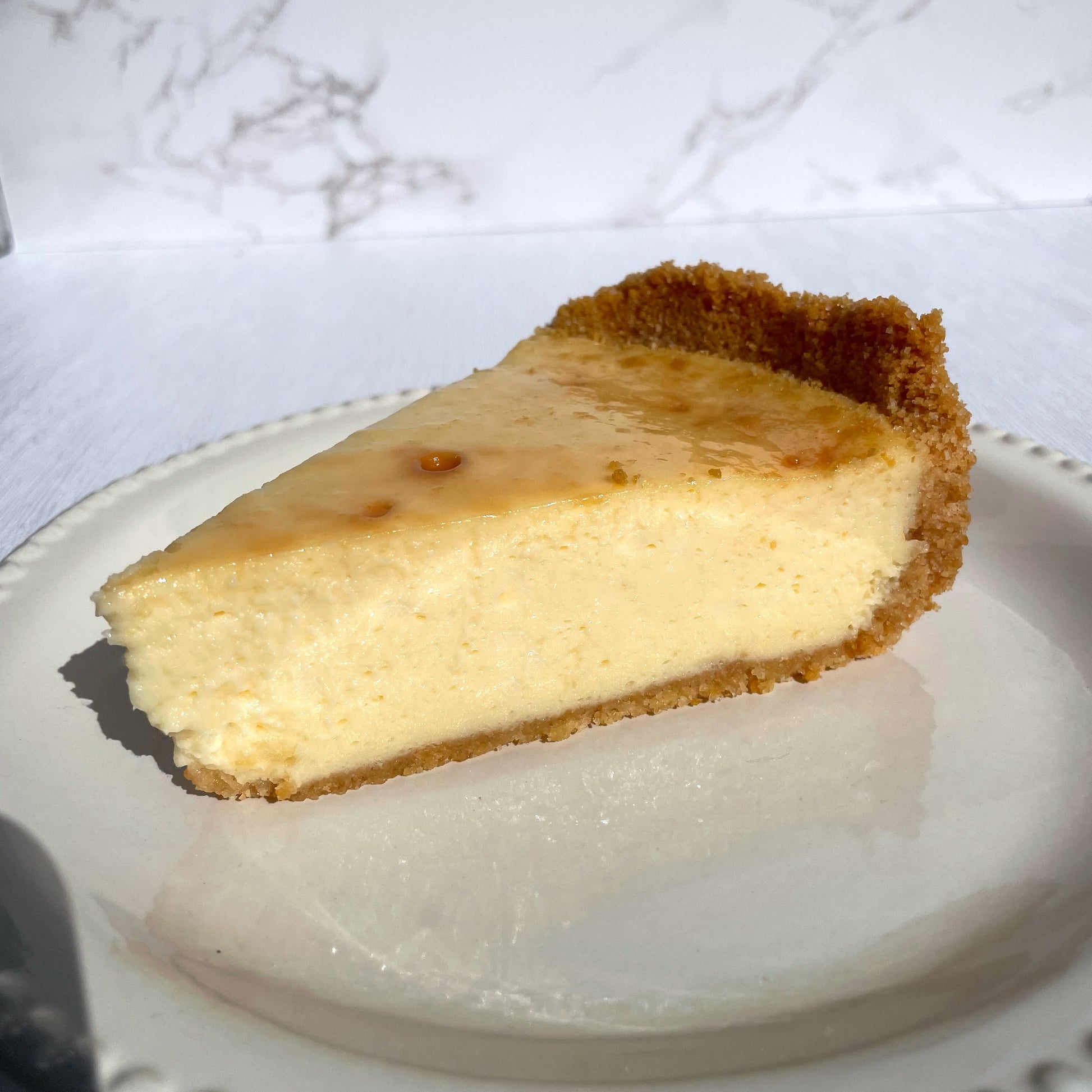 Whole baked classic vanilla cheesecake.